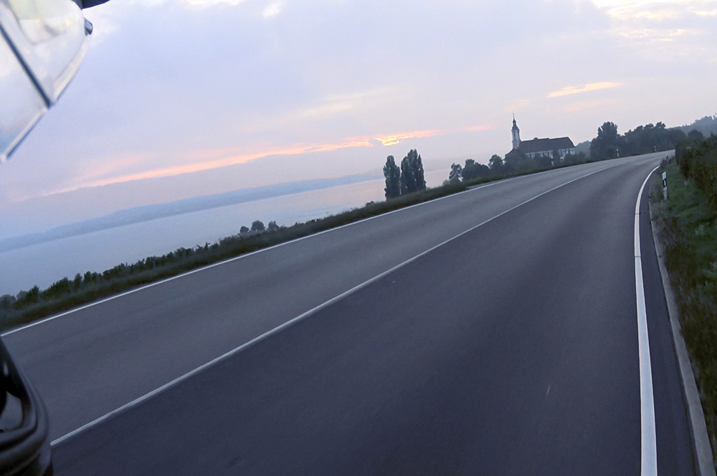 Die impossanten Eindrücke, der tosend in die Tiefe stürzenden Wassermassen noch nicht verarbeitet, folgten wir dem Rhein stromaufwärts zum Bodensee. Am abendlichen Seeufer entlang ging es zurück nach Deutschland. In Konstanz rollten wir auf die Fähre, die uns nach Meersburg übersetzte. Auf den Höhen oberhalb des Überlinger Sees führten die Letzten der 369 Kilometer zum Hotel in Bodman. Die untergehende Sonne hüllte See und Himmel in warme Farben.